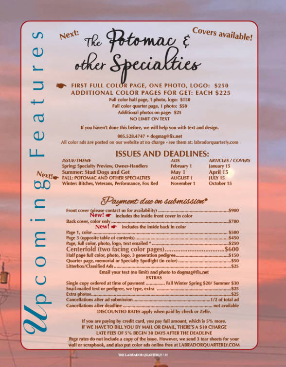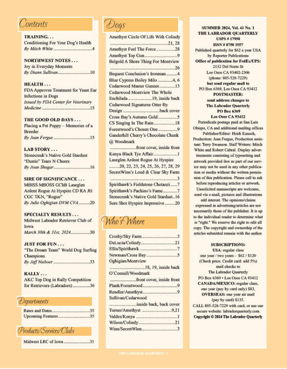…the Labrador magazine read and saved by fanciers worldwide offers articles on all aspects of Labrador care. Every Labrador lover will appreciate the Labrador Quarterly magazine, published quarterly, with monthly emailed news bulletins – all chock full of helpful articles, advice, tips, useful listings, and information from breeders, judges and handlers.